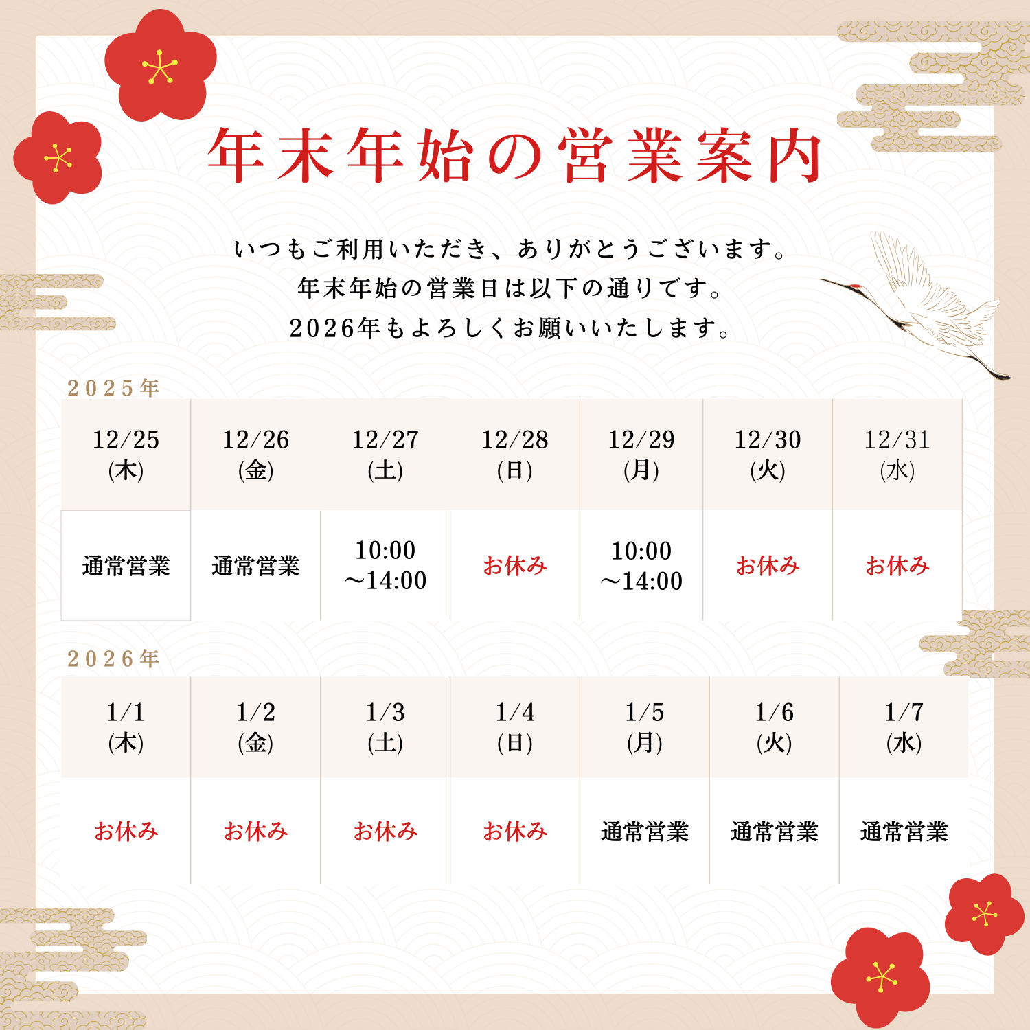 ※年内は「12月29日(月)14:00」まで、年始は「1月5日(月)10:00」より営業いたします。