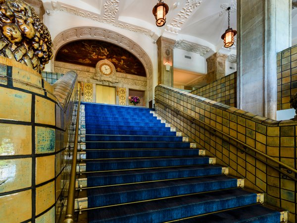 ニューグランドブルーの絨毯が敷かれたクラシカルな趣の大階段。 当時の布目模様のタイルが張られその重厚感から、ホテルの歴史と格式の高さを感じることができます。