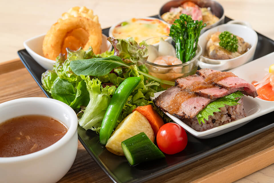 ローストビーフと21穀米/サーモンのマリネ/さくらどり・季節野菜のグリル/海老と季節野菜のオイル焼き/野菜グラタン/サラダ等/スープ/ミニスイーツ&ドリンク付
