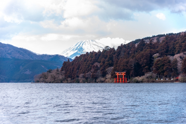 芦ノ湖に浮かぶ朱色の《平和の鳥居》は神秘的な美しさで多くの人々を魅了しています。