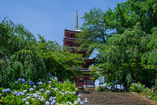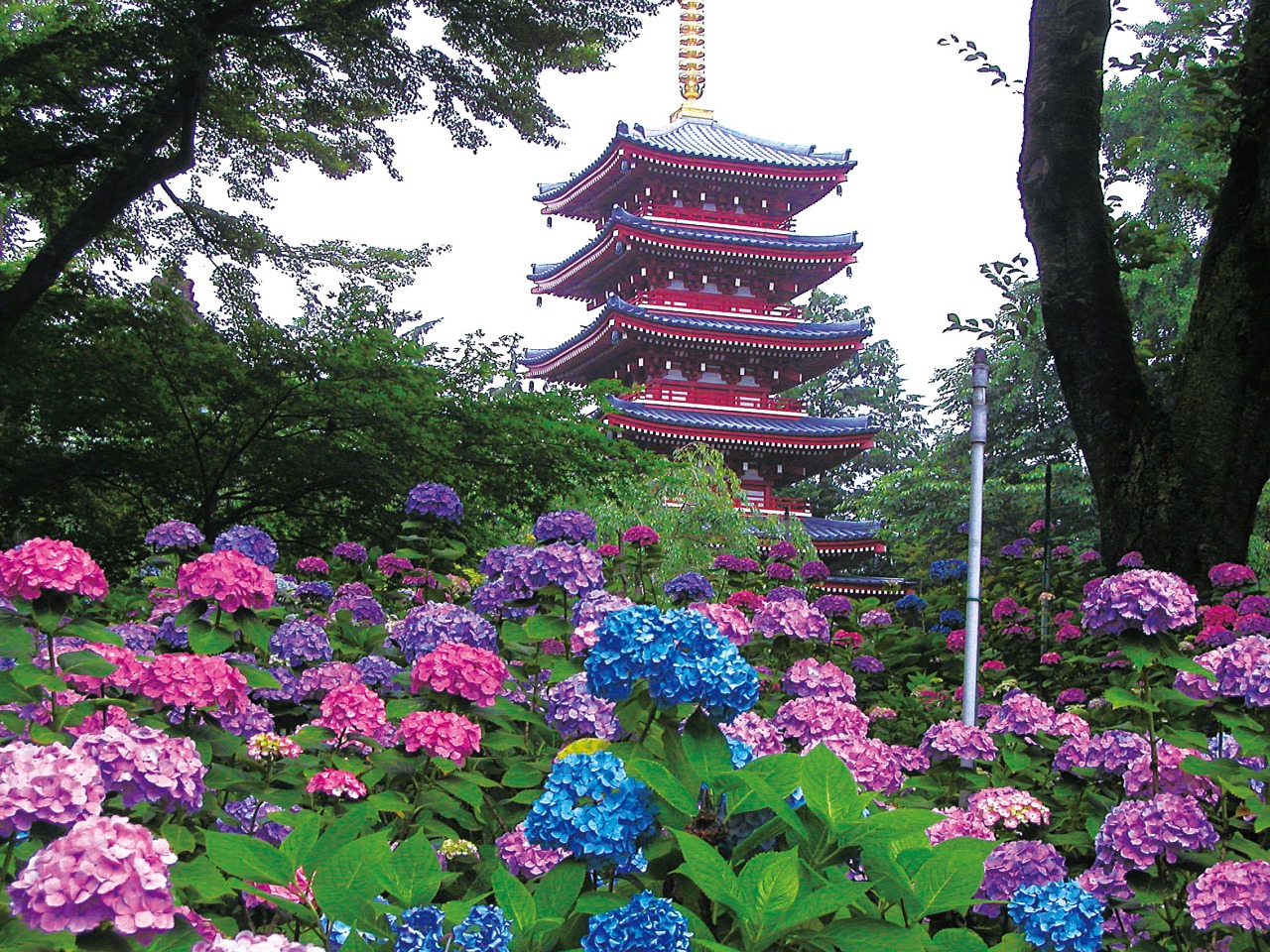 境内を埋め尽くすように咲き誇る、1万株以上の色鮮やかな紫陽花。